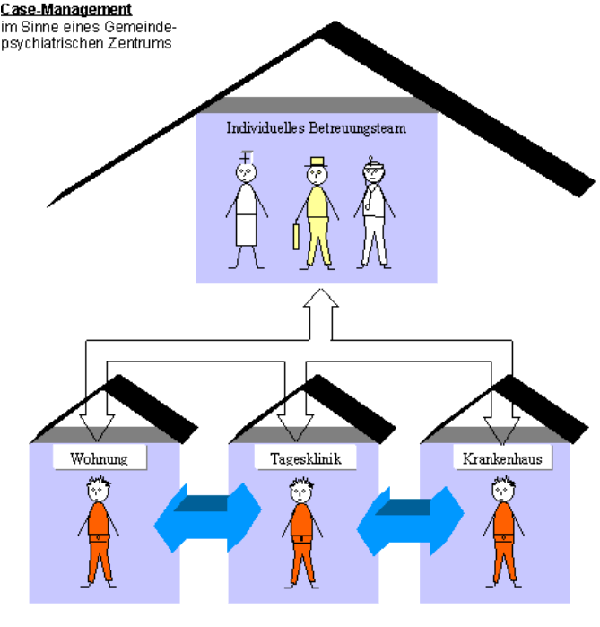 Das gemeindepsychiatrische Zentrum ist als Organisationsform gemeindenaher psychiatrischer Versorgung ein Idealfall. Grundlage ist die Idee der möglichst engen Verzahnung der verschiedenen Stadien des/der KlientIn in seinem/ihrem Krankheitsverlauf. Die Tatsache, daß viele psychisch Kranke besondere Schwierigkeiten mit der Kontaktaufnahme und -pflege haben, was allgemein schon zur Forderung nach niedrigschwelligen Angeboten geführt hat, brachte die Idee einer Kontinuität aller Betreuungspersonen längs aller Krankheitsstadien des/der KlientIn hervor. Das zunächst intramural durchgeführte Konzept (gleiches Betreuungspersonal vollstationär / teilstationär / ambulant) wurde im Rahmen des Gemeindepsychiatrischen Zentrums über die Klinikmauern hinaustransportiert. Ein/eine persönlicheR Case-ManagerIn koordiniert die verschiedenen Angebote für und mit den KlientInnen und begleitet sie durch die verschiedenen Stadien. Die/der Arzt/Ärztin betreut den/die KlientIn im Falle einer vollstationären Behandlung auf der Station, bei Entlassung, aber auch in der Tagesklinik und zu Hause. Das gleiche gilt für die anderen Betreuungspersonen.