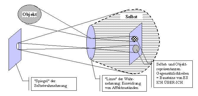 Wie aus dieser Abbildung deutlich werden soll, spielen Begriffe wie Wahrnehmung und Abbildung eine wichtige Rolle. So ist es auch möglich, daß intrapsychische Konflikte eines Individuums durch Übertragung / Projektion auf reale Beziehungen anderer Individuen in seiner Umgebung übertragen werden.